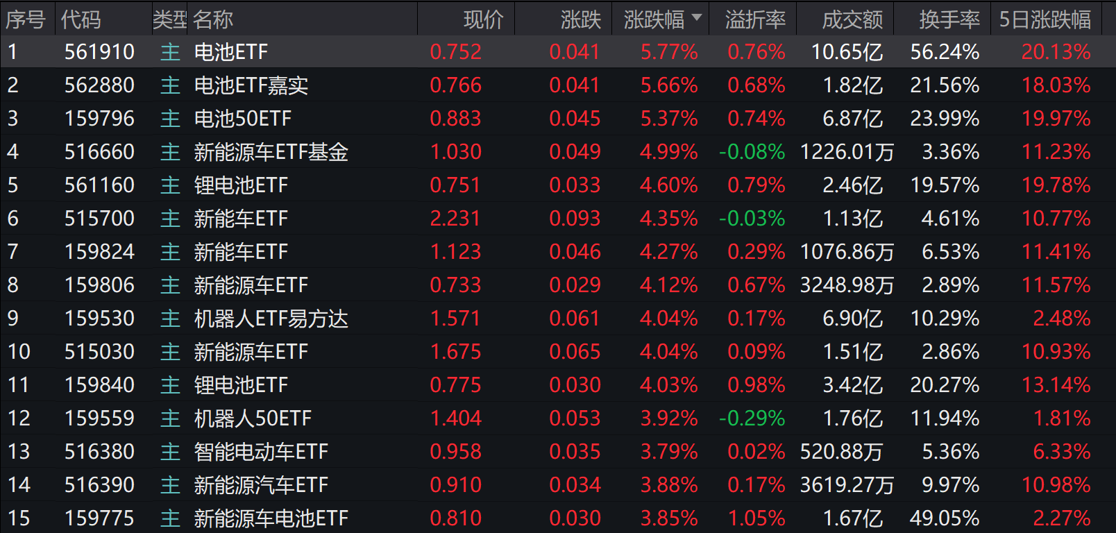 ETF方面,电池ETF霸榜,电池ETF(561910)以5.77%的涨幅位居榜首。电池ETF嘉实(562880)、电池50ETF(159796)双双涨超5%。新能源车ETF基金(516660)、锂电池ETF(561160)、新能车ETF(515700)、新能源车ETF(159806)等8只基金涨超4%。