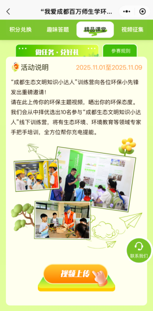 根据活动安排,成都市生态环境宣传教育与对外交流合作中心将向线上答题排名前100名的 “环保知识小能手”,发出 “成都生态文明知识小达人” 训练营的邀请!小朋友们只需要打开活动主界面,就会收到一个下图样式的弹窗,点击“确认参选”按钮,填写基本信息即可上传参赛视频。如关闭了弹窗,在活动主页面选择“视频征集”并点击“视频上传”按钮即可上传作品。