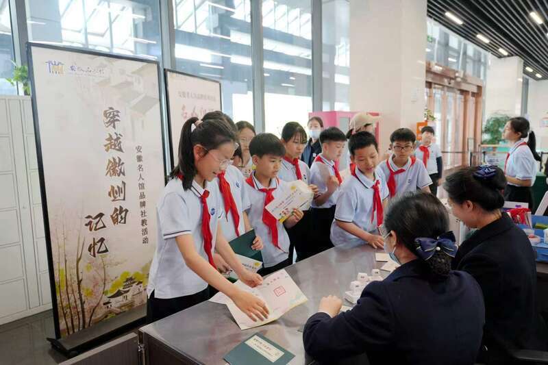 诵读结束后,学生们有序进入展厅聆听名人故事。场馆一侧的体验区,精心设计的名人主题印章一字排开,学生们手持特制的“诵读研学手册”,体验印章实践。这些印章以安徽历史上的杰出人物为原型,融合其生平事迹、经典名句与代表符号,引导青少年加深对名人事迹与精神的理解。